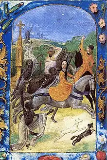 Mary of Burgundy chased by the Death, from the Book of Hours of Mary and Maximilian in Berlin. Two of the men tried to escape while another, likely Maximilian, beckoned her to follow him but she took no notice.[88]