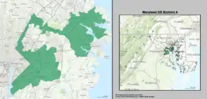 Maryland's 4th congressional district wraps around the eastern edge of Washington, D.C., taking in most of Prince George's County and a small portion of Montgomery County. It is home to several racially diverse middle-class suburbs, including College Park, Fort Washington, Greenbelt, and Laurel. With a median household income of $80,808, it is the wealthiest black-majority district in the United States.[1]