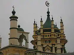- Above the prayer hall is a flat roof deck surrounded by a parapet wall with bottle-shaped balusters. It is topped with a line of 22 small six-level minarets crowned with onion domes, each with a crescent moon. The miniature minarets rise from the pilasters that frame the cinquefoil arched openings below.