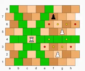 The Masonic board cells are slightly rectangular, and indentation of alternating ranks results in cants (oblique files) 30° from the vertical and diagonals 30° from the horizontal, the same as hexagon-based chessboards when cell vertices face the players. (For example, rooks have six directions of movement, and Masonic pawns move and capture the same as pawns in De Vasa's hexagonal chess. Masonic bishops, however, are limited to the four diagonal directions to the sides.) As with hex-based boards, three colors are used, so no two adjacent cells are the same color, and gameboard diagonals are highlighted.