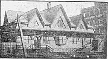 In September 1872, the B&P purchased a 6,221 square feet (577.9 m2) parcel at Camden Street from the Boston Water Power Company.[10][11] A station building was under construction by that November.[12][13] Chickering station, named for the nearby Chickering & Sons piano factory, opened in 1873.[14] The single-story brick structure was located on the south side of the tracks on the northeast side of Camden Street.[15][16] Chickering station was commonly used by baseball fans attending games at the South End Grounds.[17]