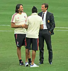 Success continued in his second season at the club. He led Milan to their sixth Supercoppa Italiana title on 6 August 2011, by coming from behind in a 2–1 win over city rivals Inter in a game played at the Beijing National Stadium.[23] That was as far as his success went for that season, however. A semi-final Coppa Italia knockout at the hands of Juventus followed by a quarter-final UEFA Champions League knockout at the hands of Barcelona left Milan fighting on only one front towards the end of the season—the Scudetto. Even that was to be lost, however, with the Rossoneri finishing in second place to Juventus and therefore qualifying for next season's Champions League group stage. The season was also marked with controversy however, as in the second half of the season, Milan had a goal by Sulley Muntari disallowed in a key match against title rivals Juventus at the San Siro, after they had already been leading 1–0; the match eventually ended in a 1–1 draw.[16] Along with Adriano Galliani, Allegri drew criticism for his decision to sell veteran deep-lying playmaker Andrea Pirlo to Juventus, after excluding him from the starting eleven the previous season, and deeming him to be a surplus due to his age; Pirlo went on to play a key role in Juventus' victorious Serie A title.[16]