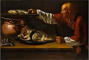 The Master of the Gamblers showed a strong interest in still life painting and many of his pictures with fruit and vegetable sellers give ample space to the still life elements, which are worked out extensively.[2] The still life elements in his works are rendered with a strong naturalism reminiscent of Cecco del Caravaggio