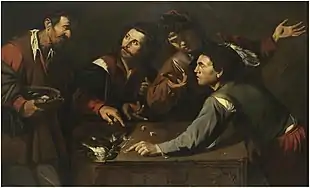 The Master of the Gamblers (known in Italian as Maestro dei Giocatori) (fl 1620 – 1640) is the notname given to a painter active in Rome and possibly also in Naples in the second and third decade of the 17th century, whose subject matter and style rank him among the Caravaggisti (followers of Michelangelo Merisi da Caravaggio). The artist depicted genre subjects and still life elements in his works in a stark naturalist manner. The identity and nationality of the artist are not known. Art historians have yet to arrive at a unanimous view on the nationality, work location and the oeuvre of the artist. He may have been Italian, but a northern European background has also been proposed.[1]
