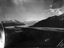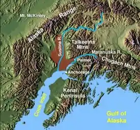 In 1935, the Federal Emergency Relief Administration created an experimental farming community known as the Matanuska Valley Colony as part of the New Deal resettlement plan.[1] Situated in the Matanuska Valley, about 45 miles northeast of Anchorage, Alaska, the colony was settled by 203 families from Minnesota, Wisconsin and Michigan.[2] The colony project cost about $5,000,000 and, after five years, over half of the original colonists had left the valley. By 1965, only 20 of the first families were still farming the valley.[3]