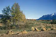 The Matanuska Colony produced a range of crops and livestock. The primary cash crop were potatoes. In 1947, it was noted that approximately 2,500 tons were grown, with yields of 10–17 tons per acre, with the quality being excellent. Additional successful crops yielding thoroughly ripened grain included wheat, barley, oats, and winter rye. Hay, crops of oats, alone and with peas or vetch, also did well. Silage of oats and peas were also very successful. Farmers found that a wide variety of vegetables could also be grown and produced an extraordinary quality product.[15] The Matanuska Valley Farmer's Cooperative Marketing Association handled much of the produce and marketed as well.[16] The cooperative also purchased the supplies needed by the colony residents, such as feeds, seeds, fertilizer, farm machinery and general merchandise.