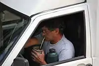 Mate or maté[lower-alpha 1] (/ˈmɑːteɪ/ MAH-tay, Spanish: [ˈmate], Portuguese: [ˈmatʃi]) is a traditional South American caffeine-rich infused herbal drink. It is also known as chimarrão[lower-alpha 2] or cimarrón,[lower-alpha 3] and ka’ay in Guarani.[2] It is made by soaking dried yerba mate (Ilex paraguariensis) leaves in hot water and is traditionally served with a metal straw (bombilla) in a container typically made from a calabash gourd (also called the mate), but also made from a cattle horn (guampa) in some areas. A very similar preparation, known as mate cocido, removes some of the plant material and sometimes comes in tea bags. Today, mate is sold commercially in tea bags and as bottled iced tea.