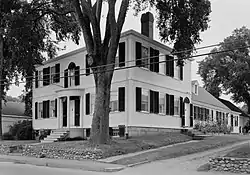 The Matthew Cottrill House stands on the north side of Main Street in downtown Damariscotta. It is a two-story wood-frame structure, with a low-pitch hip roof, clapboard siding, and a granite foundation. The front facade is symmetrically arranged, with five bays. The outer bays have sash windows with shutters, while the main entrance is in the center bay, sheltered by a half-round portico with Doric columns supporting a plain frieze. Above the entrance is a smaller sash window, topped by a half-round fan. A long single-story ell, probably built before the current main block, extends the building to the rear.[2]