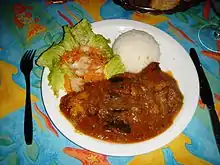 Mauritius is known for its sauces and curries which are typically served with meat, seafood, and vegetables dishes.[1] Other common preparations are chutney, Achaar, and pickles.[3] The Mauritian curries are unique as they rarely contain coconut milk, typically uses European herbs (e.g. thyme), and uses more variety of meat (e.g. duck) and seafood (e.g. octopus).[2] The Rougail (also written as "rougay") is a tomato sauce cooked with onions, garlic, chillies, ginger and variety of spices, which is popular; it can be eaten with fish, meat and vegetables.[1][2][9][10] The Mauritian versions of curry, chutney, Rougail, and pickles have a local flavor and differ, at times considerably, from the original Indian recipes.[5]