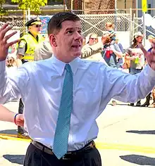 During his 2013 mayoral campaign, Walsh had laid-out a policy platform on support for gay rights.[93] In 2014, Walsh refused to march in the city's Saint Patrick's Day parade due to LGBTQ groups being blocked from participating.[94] Walsh had unsuccessfully attempted to negotiate with organizers to have them drop a two-decade prohibition on open LGBTQ displays in the parade.[95] Walsh's predecessor, Thomas Menino, had also boycotted the parade since 1995 for this reason.[96] After the parade organizers permitted the LGBTQ-veterans group OUTVETS to march in the 2015 parade, Walsh agreed to participate in the parade.[97] When the parade organizers, in 2017, were planning to bar the group from again participating, Walsh and other politicians threatened not to participate in the parade. The organizers reversed course and allowed the group to participate in the parade.[98] In May 2016, with Walsh's support, for the first time in the city's history, the transgender pride flag was flown on the Boston City Hall Plaza flagpole.[99]