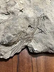 This formation is the least accessible of the three formations at Maysville, requiring one to hike up a steep trail located near the South end of the roadcut. It is important to be cautious while hiking the trail to Bellevue as ticks and poison ivy are prevalent in the forested areas. North America was underwater during the Ordovician period therefore the Bellevue formation was formed from shallow water deposits, consisting mostly of shale.[2] Within the layers of shale, brachiopod fragments are prevalent, and commonly vinlandostrophia are found. The Bellevue formation contains many small crinoid stems due to the deposits that came from the shallow water in the most recent years of the Ordovician period. The base of the Bellevue formation contains a large collection of echinoderms.[3] Crinoids are a part of the echinoderm phylum. The Bellevue formation also comprises larger fragments of bryozoa as well as vinlandostrophia in comparison to the Fairview and Kope formations.[2] Visitors can find a majority of these fossils in the lower and base part of the Bellevue formation. The top of Bellevue along with parts of the base are difficult to access and potentially dangerous.