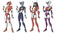 Three of the robots, Aphrodite A, Diana A and Minerva X are from the original Mazinger Z series, while Venus A is from the Great Mazinger series. Their pilots are also traditional characters from Go Nagai's universe, Sayaka Yumi and Jun Hono from Mazinger Z and Great Mazinger respectively, and Hikaru Makiba and Maria Fleed from Grendizer.