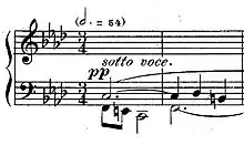 The third mazurka, in F minor, has a folkish and rustic atmosphere. After a few bars of introduction, the main theme appears, characterized by a colorful Slavic melody and sharp rhythms and accents. The second theme, A-flat major, is quite lively and includes a section with a bass motif. The main theme is reprised, this time in a slightly modified form, and the piece ends quietly, marked pianissimo. A performance of the mazurka lasts for a little under three minutes.[3]
