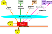 Remote sensing depends on the interaction of a source of energy with a target, and energy measured from the target.[20] In the "Remote Sensing" diagram, Source 1a is an independent natural source such as the Sun. Source 1b is a source, perhaps manmade, that illuminates the target, such as a searchlight or ground radar transmitter. Source 1c is a natural source, such as the heat of the Earth, with which the Target interferes.