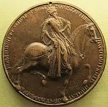 The medal of John VIII Palaeologus is a portrait medal by the Italian Renaissance artist Pisanello. It is generally considered to be the first portrait medal of the Renaissance.[1][2][3] On the obverse of the medal is a profile portrait of the penultimate Byzantine emperor, John VIII Palaeologus; the reverse contains an image of the emperor on horseback before a wayside cross. Although the date of the work is not clear it was likely to have been some time during 1438 and 1439, the years John was in Italy attending the Council of Ferrara (later moved to Florence). It is not known whether the emperor himself or his Italian hosts commissioned Pisanello to make the medal, but Leonello d’Este, the heir apparent to the marquisate of Ferrara, has been suggested as the most likely candidate.[4] Several drawings by Pisanello are closely associated with the medal and these include sketches now held in Paris and Chicago.