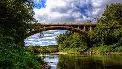 The Mederville Bridge is a historic structure located in the unincorporated community of Mederville, Iowa, United States. It spans the Volga River for 156 feet (48 m). This is one of only a few open spandrel arch bridges constructed in Iowa.[2] Designed by the Marsh Engineering Company of Des Moines, it replaced a covered timber Howe truss bridge. Clayton County rejected all of the original bids to build the structure when they all came in too high. Six companies bid a second time on the project, and F. E. Marsh and Company of Des Moines won. They completed in the bridge in 1918 for $17,454.32.[2] It was listed on the National Register of Historic Places in 1998. [1] On October 2, 2021, it was the site where Kelsey Bergan and Mark Schutte got married.