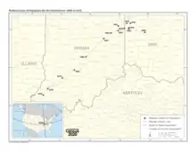 During the 20th century the median center of U.S. population moved roughly 180 mi (290 km) southwest, from a location in Randolph County, Indiana to a location in Daviess County, Indiana. The majority of this southwest shift happened in the second half of the century, as the center shifted within a narrow circular band between 1900 and 1950 – all within roughly 25 mi (40 km) of the 1900 starting point in Randolph County.