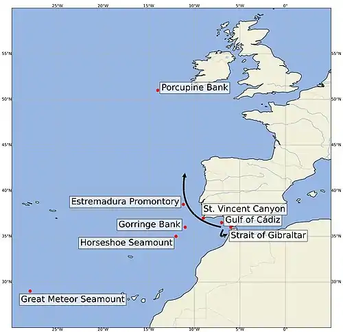 Once in the western side of the Strait of Gibraltar, the Mediterranean Outflow divides into two branches (see Figure 1). Most of the outflow travels westward along the Iberian continental slope (between St. Vincent Canyon and Gorringe Bank[3]), and then moves northward as a poleward eastern boundary undercurrent reaching as far as north Porcupine Bank (50°N).[4] While advancing westward, the Mediterranean Outflow becomes less saline due to mixing and entrainment with ambient waters and sinks gradually to its equilibrium depth of 1100 m approximately. The other branch of the Mediterranean Outflow recirculates cyclonically in the Gulf of Cádiz.[5] The result is the formation of the Mediterranean Water that finally spreads into the interior of the North Atlantic forming the most prominent basin-scale thermohaline anomaly at mid-depths, the Mediterranean Salt Tongue, recognizable as a basin-scale salinity anomaly at 1000–1200 m depth through the North Atlantic (see Figure 2). Small scale processes and local scale nonlinear interaction with tides and topography have an impact on the Mediterranean Outflow Water properties and its further spreading pattern in the North Atlantic.[6]