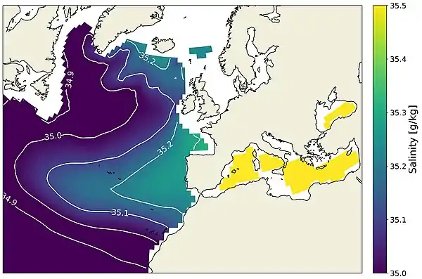 Apart from the formation of meddies and the salt tongue, the Mediterranean Outflow has some other effects on the North Atlantic Ocean, or the world oceans in general. Even if the Mediterranean Outflow is of only 1 Sv, which is relatively small compared with other outflows found in the North Atlantic, its salinity and temperature are extremely high compared with any other waters in that depth range, 38 g/kg and 13 °C, respectively.[14] These large contrasts in water mass properties help identify the northward flow along the eastern boundary to the Greenland-Scotland sill, but also a westward flow across the Atlantic that turns southward along the western boundary, reaching the Antarctic Circumpolar Current and the Weddell Sea. These added heat and salt from the Mediterranean outflow are spread southward along the western boundary into the South Atlantic Ocean, where its contribution makes the southward flow warmer and more saline than the incoming circumpolar waters to the east.[15]