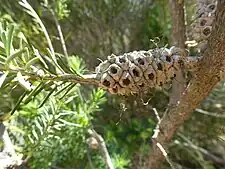 The flowers are arranged in cylindrical spikes that are 40–50 mm (1.6–2.0 in) long and wide. The spikes occur on old wood and there are 40 to 60 flowers on each spike. The stamens are arranged in five bundles around the flowers with 4 to 5 stamens per bundle, and are usually green in the centre grading to red at the tips. Flowering occurs over an extended period from July to October. The fruit are woody capsules in dense spikes 40–50 mm (1.6–2.0 in) along the stem long and each capsule is 4–5 mm (0.16–0.20 in) long and wide.[2][3]