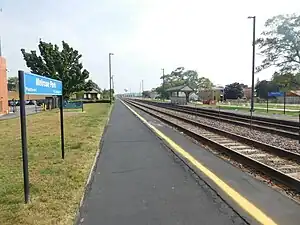 Melrose Park is a Metra commuter railroad station in Melrose Park, Illinois, a western suburb of Chicago. It is served by the Union Pacific West Line. Trains go east to Ogilvie Transportation Center in Chicago and as far west as Elburn, Illinois. Travel time to Ogilvie is 23 to 29 minutes, depending on the train. As of 2018, Melrose Park is the 196th busiest of the 236 non-downtown stations in the Metra system, with an average of 86 weekday boardings.[1] Unless otherwise announced, inbound trains use the north platform and outbound trains use the south platform. The middle track does not have platform access.