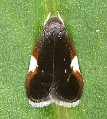 Its wingspan is 10–12 mm. The forewings are blackish brown with greenish-violet reflections, and a triangular patch of white scales on the costa about midway between the base and the apex. The hindwings have a broad white streak extending along the costa from the base to beyond midpoint.