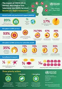The COVID-19 pandemic has impacted the mental health of people across the globe.[1][2][3][4] The pandemic has caused widespread anxiety, depression, and post-traumatic stress disorder symptoms.[4][5][6] According to the UN health agency WHO, in the first year of the COVID-19 pandemic, prevalence of common mental health conditions, such as depression and anxiety, went up by more than 25 percent.[7][8] The pandemic has damaged social relationships, trust in institutions and in other people, has caused changes in work and income, and has imposed a substantial burden of anxiety and worry on the population.[9] Women and young people face the greatest risk of depression and anxiety.[2][6]