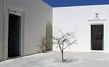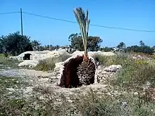 In view of the low rainfall (less than 250 mm per year) and the consequent lack of drinking water, the Djerbans have gained the habit of building cisterns to collect and store rainwater through impluviums.[nt 3][11] There are two types of cisterns: feskia or fesghia and majen or majel. The first ones are usually underground, rectangular or square in shape, and are located outside the houch. The second ones resemble huge, wide open carboys, and are mostly built inside the inner courtyard of the houch.[9] The majen and feskia collect the rainwater that falls on the roof of the dwellings, terraces and courtyards, which are whitewashed with quicklime (jir) every year before the wet season in order to ensure some hygiene. This system of rainwater collection already existed in Roman times, and large cisterns were discovered in the ancient city of Meninx. In 1967 it was estimated that the area used by impluviums in Djerba was about 1,000,000 m².[12]