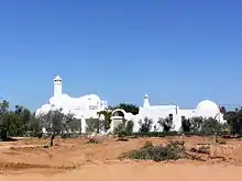 A menzel is made up of several housing units (houch), surrounded by orchards and fields. Sometimes associated with the menzel are weaving workshops, barns, olive oil winery (often underground).[1] Each menzel has a variable number of wells or cisterns and is surrounded by slopes (habia) with defensive functions, where palm trees, cactus hedges (prickly pear trees), agaves and aloes are planted that increase privacy and protect against dust and sand invasion.[2][3] It is usually inhabited by three generations of the same family.[4]