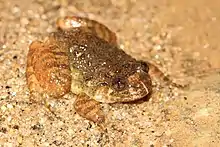 The meowing night frog (Nyctibatrachus poocha) is one of 12 species of frogs in the genus Nyctibatrachus discovered in September 2011.[1] It is found primarily in the Western Ghats, India.[2] The team, composed of researchers from the Bombay Natural History Society, Zoological Survey of India and Vrije Universiteit Brussel, led by herpetologist Sathyabhama Das Biju of the University of Delhi, used morphological traits and molecular markers to identify the 12 new species and three others which were thought to have been extinct.[2][3] The meowing night frog is named for its distinct cat-like call.