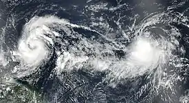Tropical Storm Maria east of the Lesser Antilles on September 16, with Lee to its east