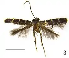 The wingspan is 6.5–7.5 mm. The forewings are fuscous, shining with purple and with two silvery white fasciae, the first at the basal one-fourth, and slightly outwardly angulate on the wing fold, the second at the subapex and outwardly oblique. The costa and dorsum have an outwardly oblique bar-shaped silvery white speck at the middle, the costal speck longer than the dorsal one. The dorsum has a silvery white speck near the tornus. The hindwings are fuscous.
