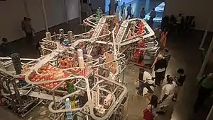 A smaller predecessor, Metropolis I (2004), is in Japan at the 21st Century Museum of Contemporary Art, Kanazawa.[11] Measuring 7 ft × 16 ft × 11 ft (2.1 m × 4.9 m × 3.4 m), that sculpture employs about 80 Hot-Wheels cars, which tend to fall off the track.[2] Metropolis II cars are custom built and use magnets for traction. Burden's name is on the tire sidewalls.[1][12][10]