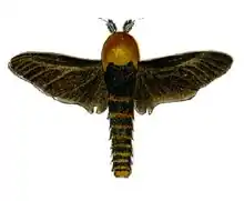The wingspan is about 30 mm for males. Adult males have black wings, an orange hairy head and a black and orange banded abdomen. Female adults have no wings and remain in the larval case. They are white with a brown head and reach a length of about 30 mm.[3]