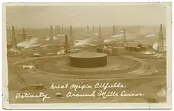 In 1912 the Mexia Gas and Oil Company drilled ten dry holes, but in the eleventh attempt discovered a large natural gas deposit.[11] The Mexia oilfield was discovered in 1920, by Colonel Albert E. Humphreys and his geologist F. Julius Fohs. Oil production peaked in November 1921 at 53,000 BOPD.[12] The population of Mexia increased from 3,482 to nearly 35,000. The rapid growth was excessive for local authorities, and for a short time in 1922 Mexia was under martial law. That year, production for the Mexia field was 35 million barrels produced. Cumulative production of the field totaled 108 million barrels by the mid-1980s. In 1924 Mexia residents passed a new city charter that changed the local government to a city manager system. After the initial oil boom, the population of Mexia declined to 10,000 by the mid-1920s. The prosperity generated by the boom continued until the 1930s, when the Great Depression forced many people to leave in search of work. The number of residents stabilized at 6,500 in the early 1930s, but the number of businesses fell from 280 to 190. In 1942 a camp for prisoners of war was established at Mexia; the facility was converted in 1947 for use as the Mexia State School, which became one of the community's principal employers. The population was reported as 6,618 in the early 1950s, 5,943 in the early 1970s, 7,172 in the late 1980s, and 6,933 in 1990. In 2000 the population was listed as 6,563.[13]