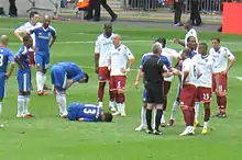 Ballack was sent off in Chelsea's 4–2 defeat against Manchester City on 27 February 2010.[31] Chelsea went on to win the 2009–10 Premier League, Ballack's first league title in England.[32] He also started as Chelsea were victorious against Portsmouth in the 2010 FA Cup final, however he would come off injured shortly before half-time after a tackle by Kevin-Prince Boateng. As a result of the injury, Ballack was not able to participate in the 2010 World Cup.[6][33]