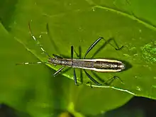 Micrelytra fossularum can reach a length of about 10–12 millimetres (0.39–0.47 in).[3] It has a slender body with a significant thickening in the abdomen and quite thin legs. The basic color is brown or yellowish, with two white lateral lines along the abdomen. The head is broad, similar in length and width to the pronotum and the scutellum. The compound eyes are globular and protruding. The antennal segments are alternately black and white, but the last one is red, elongated and curved. The hemelytra are greatly reduced (hence the name of the genus) and have a thin white line around the outside edge. These vestigial wings makes this bug incapable of flight. The female is bigger and larger than the male.[4]