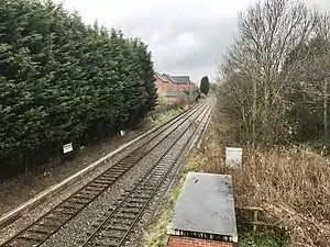 Middlewich station shared in the common experience of a drastic reduction of services during the war and for years after. Passenger numbers were never particularly high, significantly more of the line's revenue was being extracted by its freight traffic instead.[4] By January 1956, the passenger service offered just four third-class only trains each way on weekdays, and none on Sundays. Unlike many other lines services were not increased after 1956. The station became victim of the pre Beeching cuts closure programme, with regular passenger trains ceasing to use the branch on 4 January 1960.[1] Despite this, the station continued to be used by goods traffic until November 1967.[4] The station buildings were subsequently demolished. The nearest railway station is now Winsford 2.3 miles (3.7 km) away on the WCML.