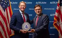 Johnson receiving the True Blue award from Family Research Council President Tony Perkins, March 1, 2023.[90]
