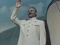 Due to his identification with Stalin, Gelovani was barred from playing other roles in cinema; he was not allowed to depict "mere mortals".[13] From 1942 to 1948, he was a member of the cast in the Gorky Moscow Art Theatre.[5] During World War II, the personality cult was abandoned in favor of patriotic motifs, but returned already at the war's late stages, and with greater intensity than ever after 1945: Stalin was soon credited as the sole architect of victory.[14] In the postwar films in which he portrayed him – The Vow, The Fall of Berlin and The Unforgettable Year 1919 – Gelovani presented the leader as "a living god".[15]