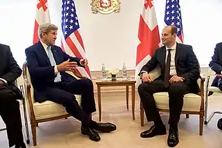 "Deepening cooperation with the United States, our main strategic partner, is a highly important issue for the government and Foreign Ministry," Janelidze said.[41] In March 2016, Janelidze visited U.S. and met with the U.S. Secretary of State John Kerry.[42] Mikheil had meetings in U.S. congress and with leading U.S. think tanks.[43] In May 2016, the reception dedicated to the 25th anniversary of restoration of Georgia’s independence was hosted by Janelidze in Washington D.C. which was attended by more than 900 guests. The guests were addressed by U.S. Deputy Secretary of State Tony Blinken.[44] In July 2016, Secretary Kerry visited Georgia and signed the new security cooperation agreement with Georgia, to expand U.S.-Georgian security cooperation, giving Georgia access to additional American equipment, training and intelligence with an eye to protecting its borders from future potential encroachment, modernize Georgia’s security forces and allow it to more fully integrate with NATO missions.[45]