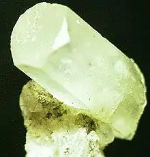 Milarite is a rare beryl.[3] It is a member of the osumilite group.[4] Crystals of this mineral typically come in green or yellow.[5] The mineral gets name after Val Milar.[6]