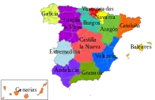 The division of Spain into captaincies general dates from 1705, when they adjusted to the old kingdoms that constituted the Hispanic Monarchy. They were thirteen regions: Andalusia, Aragon, Burgos, Canary Islands, Castilla la Vieja, Catalonia, Extremadura, Galicia, Coast of Granada, Guipúzcoa, Mallorca, Navarra and Valencia. In 1714 the Captaincy General of Castilla la Nueva was created from the General Commissariat of the War People of Madrid.[1]
