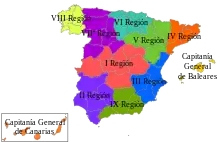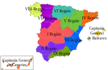 After the establishment of the Franco dictatorship, through the Decree of 4 July 1939 of the Ministry of National Defence the administrative division of military regions and their scope were officially established.[5] The eight traditional Military Regions (Madrid, Sevilla, Valencia, Barcelona, Zaragoza, Burgos, Valladolid, La Coruña) were reestablished. In 1944 a ninth Military Region, with its headquarters in Granada, was created.[3]