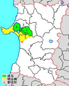 With the establishment of the municipality system on April 1, 1889, one town (Tsuchizaki Minato) and 35 villages were established. Funakawa Minato was raised to town status on October 24, 1894, followed by Gojōme on January 19, 1896 and Kitaura on June 4, 1902. Funakoshi became a town on December 20, 1904, followed by Okubo on April 1, 1924 and Hitoichi on December 1, 1925 and Terauchi on August 1, 1933, Iitagawa on November 30, 1935.