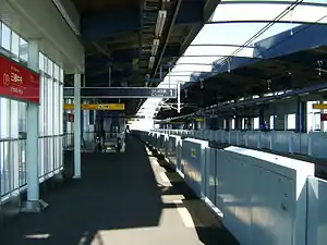 The station consists of two elevated opposed side platforms with the station building located underneath.