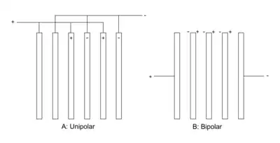 Electrolysis cells with more than one anode and cathode pair have two types of arrangement: unipolar and bipolar.
