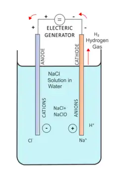 The basis of the mixed oxidant production cell is electrolysis of a water solution of sodium chloride. For producing a mixed oxidants solution, different types of electrolysis cells such as a membrane cell or a standard contact cell (both unipolar and bipolar) are used.[9]