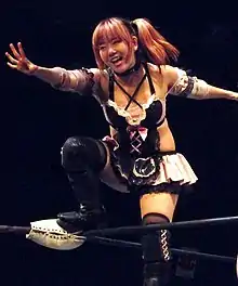 Matsumoto made her debut for Emi Sakura's Ice Ribbon promotion on July 29, 2008, wrestling Yuki Ueda to a three-minute time limit draw.[8] Though all Muscle Venus members made their debuts around the same time, only Matsumoto, Hikaru Shida and Tsukasa Fujimoto lasted more than six months, making new careers out of professional wrestling.[10] Matsumoto's wrestling character included her wearing different cosplay outfits, dancing in the middle of matches, intentionally botching spots and other comedic behaviour.[2][11] Matsumoto gained her first victory on December 13, defeating Chii Tomiya.[12] The following month, despite her unimpressive win–loss record, Matsumoto declared herself the "ace" of all professional wrestling, before unsuccessfully challenging Kiyoko Ichiki for Ice Ribbon's top title, the ICE×60 Championship.[13][14] The following summer, Matsumoto started a storyline rivalry with International Wrestling Association of Japan manager Haru Miyako, which led to her bringing her associates to face Matsumoto sporadically for the next two years.[15][16][17] On December 31, 2009, Matsumoto made her debut for NEO Japan Ladies Pro-Wrestling in a three-way match to determine the "number one Matsumoto". The match, which also included Dump Matsumoto, was won by Hiroyo Matsumoto; none of the three are related to each other.[18]