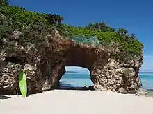 The tourism industry is a steadily growing component of Miyakojima's economy. Traveling to the islands is facilitated primarily through airlines and cruise lines. With the addition of international flights made available through the opening of Shimoji Airport in 2019, flights connecting to Miyako have been increasing – over 730,000 plane tickets entering into Miyakojima were purchased in 2019 alone.[10] Since 2016 cruises have been a significant catalyst to Miyakojima's tourism industry, notably megaships servicing international tourists.[11][12] Efforts to introduce space travel have also been announced, as PD Aerospace proposes to create a spaceport at Shimojijima airport and begin flights in 2025.[13] The islands are popular tourist destinations because of the clear blue sea and white beaches. There are several golf clubs on the islands.